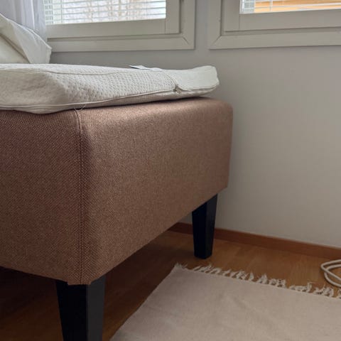 Sängyn kangas hiukan nukkaantunut, muuten sänky on ehjä.