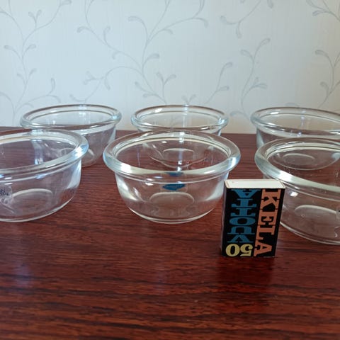 Arabia / Nuutajärvi Luna kulho. Läpinäkyvät lasikulhot soveltuvat esimerkiksi tarjoiluun. Kuvissa näkyy useampi erikokoinen kulho samasta sarjasta. Tietoja; paino 0,45 kg, Koko korkeus 6 cm, halkaisija 15.2 cm, Suunnittelija , Kaj Franck, Väri kirkas, Valmistettu 1971-1993. Näitä kaksi kpl. Hinta yhdelle 8 euroa, jos otat molemmat, niin hinta 15 euroa. Voin lähettää. Mmm.