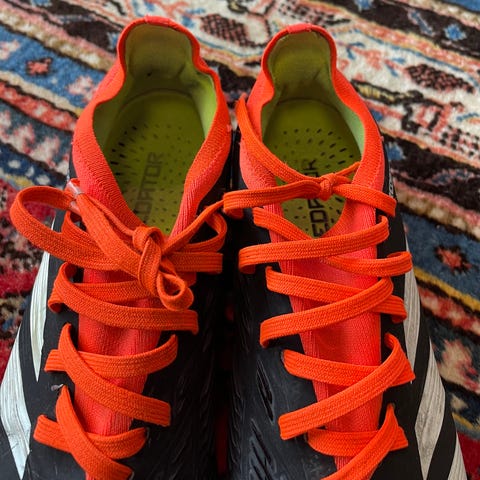 Adidas predator jalkapallokengät / nappikset, koko 38 1/3. Väri pääosin musta, oranssit nauhat ja yksityiskohdat sekä limenvihreä sisävuori. Kengissä nappulapohja, joka soveltuu jalkapallon pelaamiseen nurmialustalla. Nauhakiinnitys mahdollistaa istuvuuden säätämisen. Sopivat jalkapallokenkää etsivälle pelaajalle, jonka kengänkoko on 38.