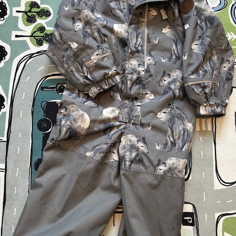 Reilu vk-haalari, koko 104cm. Vetoketju menee lahkeeseen asti, lenksut kuluneet. Puntteja pystyy leventään. Polvet hieman pehmenneet.