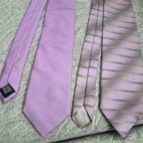 Miesten solmiot. Toinen solmio on yksivärinen tummansininen ja toinen sinipohjainen raidallinen, jossa on harmaan, punaisen ja valkoisen sävyjä. Sopivat käytettäväksi esimerkiksi puvun tai kauluspaidan kanssa arki- ja juhlatilaisuuksissa.