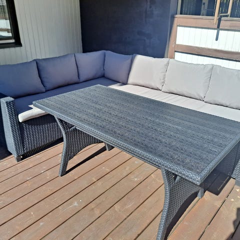Käytetty kalusteet , on ollut katoksen alla koko aika, just öljyllä käsitelty. Isolle porukalle kuuluu iso pöytä (+ välipala), kaksi penkkiä , kaksi tuolia ja senkki. Ei lahopuuta, pientä kiristystä vailla. Kuljetuksissa voisin auttaa.