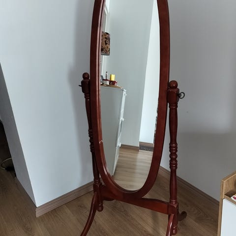 Puuinen senkki, jossa kolme alaovea ja kolme ylälaatikkoa. Senkin yläosassa on kapea peili ja korotettu taustaosa. Huonekalu seisoo kaarevilla jaloilla. Sopii esimerkiksi olohuoneeseen, ruokailutilaan tai eteiseen säilytyskalusteeksi ja tasoksi. Ulkonäöltään vanhahtava, mahdollinen kunnostus- tai entisöintikohde.