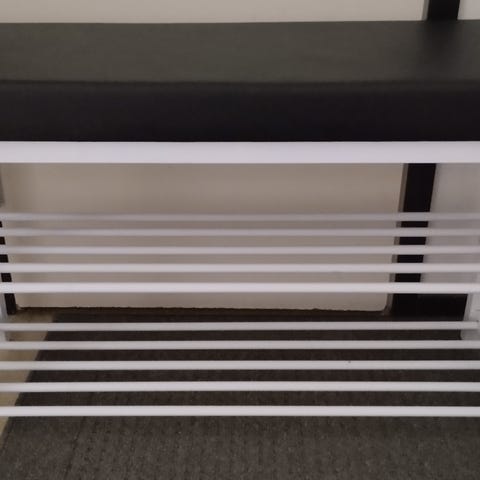 Kenkäteline, jossa istuinpenkki. Rungossa on kaksi valkoista metallista kenkähyllyä ja päällä puunvärinen taso, joka toimii istuimena tai laskutasona. Sopii esimerkiksi eteiseen kenkien säilytykseen ja pukemiseen. Materiaalit: metallirunko ja puunvärinen levy. Väri: valkoinen runko, puunvärinen kansi.