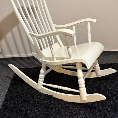 Aivan ihana valkoinen keinutuoli! Ei liian iso ja hyvä keinua. Kaunis luonnonvalkoiset väri. Hyvä kunto.