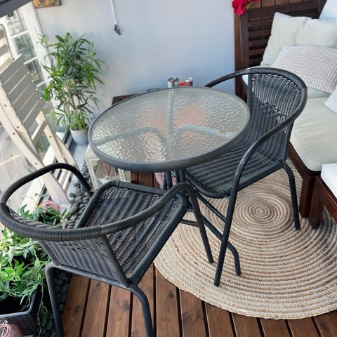 Parvekekalustesetti pyöreä lasipöytä ja kaksi tuolia harmaa