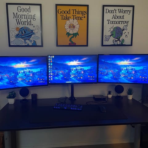 2 x Samsung 27" kaareva näyttö. Muistaakseni Samsung Odyssey G5, mutta kannattaa tarkistaa vielä mallitiedoista.