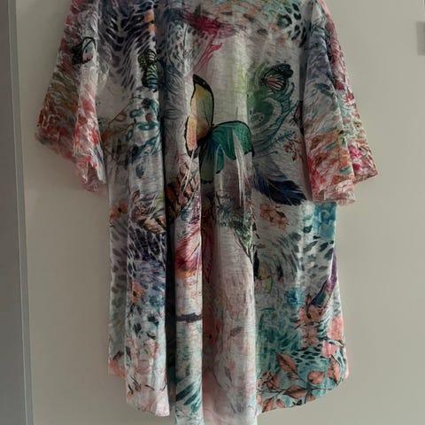 Halonen, naisten paita, koko XL. Materiaalina viskoosi joustolla. Paidassa on kirjava kukkakuviointi valkoisella pohjalla sekä lyhyet hihat ja pyöreä pääntie. Sopii arki- ja vapaa-ajan käyttöön.