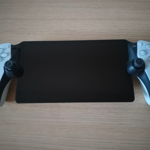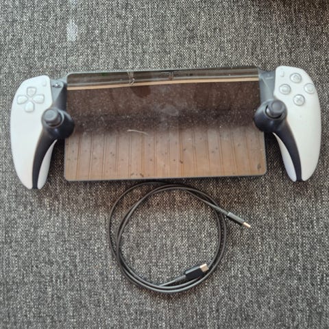 Sony PlayStation Portal Remote Player käsikonsoli PlayStation-järjestelmälle. Laitteessa on keskellä kosketusnäyttö ja molemmilla puolilla PlayStation-ohjaimesta tutut painikkeet ja analogitatit. Väri on valkoinen mustilla yksityiskohdilla. Soveltuu PlayStation-pelien etäpelaamiseen yhteensopivan PlayStation-konsolin kanssa.