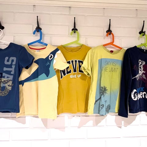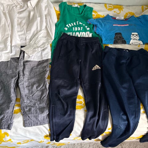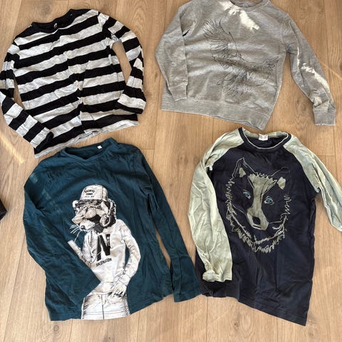 Pieni paitapaketti koossa 130-140. Sisältää kolme t-paitaa (punainen Me&I) ja kolme pitkähihaista puseroa. Osa t-paidoista enemmän käytetty mutta suurin osa vaatteista eri omaisessa kunnossa ja vähän käytettyjä.
