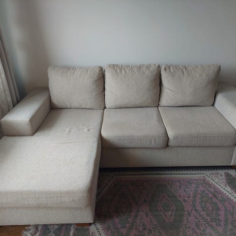 Siisti ja hyväkuntoinen sohva. Sohvaa on pesty säännöllisesti sohvapesurilla. Mukava istua ja sopii hyvin arkeen.
