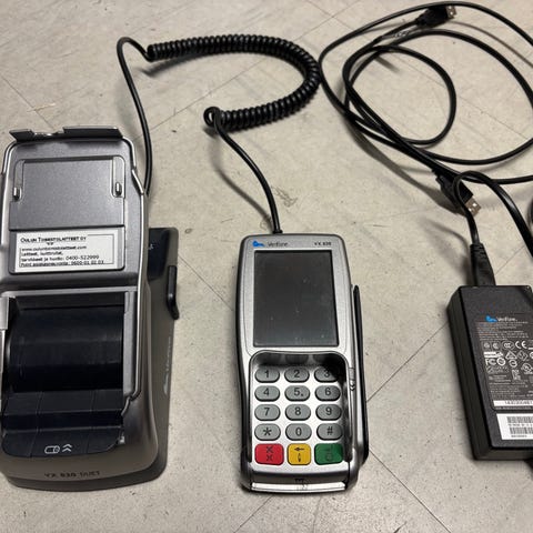 Pakettiin kuuluu kaksi korttimaksupäätettä sekä virtalähteet ja kaapelit kuvien mukaisesti. Usb-kaapeli mukana.