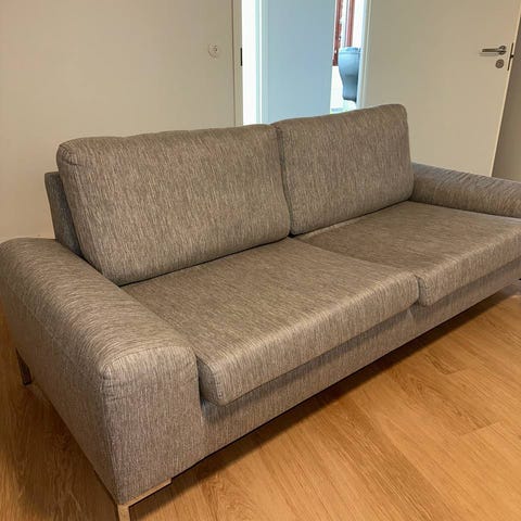 Hyväkuntoinen mukava sohva nuorekkaaseen makuun. Sileä tummanharmaa kangas, metalliset putkijalat. Kevyt kannettava.