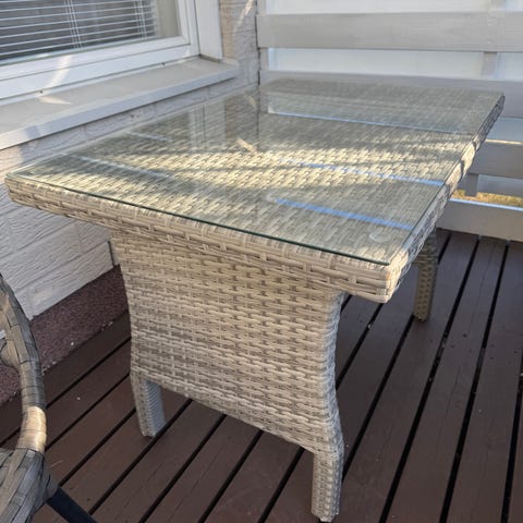 Vähäisessä käytössä ollut harmaa polyrottinkikalusto, tuolit näyttäisi täysin ehjiltä, 2-istuttavassa muutamassa kohtaa katkoksia, pöydässä lasikansi ja kannen alla pöydässä katkospaikkoja. Koeistuttu ja tukeva kalusto kaikin puolin. Huvimaja käytössä ollut.