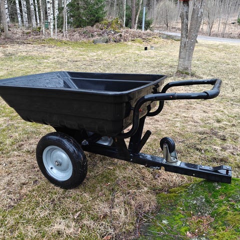 Vihreät kottikärryt, joissa muovinen 160L kuuppa ja metallinen runko. Kahdet ilmakumipyörät edessä ja tukijalat takana. Jämäkkä ja helppokäyttöinen, käytetty pari kertaa viime syksynä.