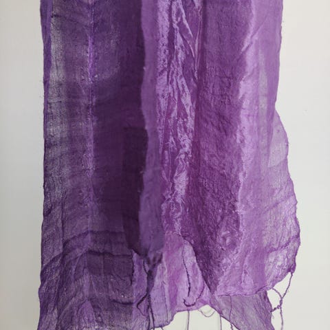 Erittäin kaunis, hyväkuntoinen silkkihuivi. Kaunis värimaailma, sopiva asuste keväälle ja kesälle. Säilytyksestä hieman rypyssä. Käsin värjätty, joten täysin uniikki asuste. Huivin koko n. 52 x 53 cm.