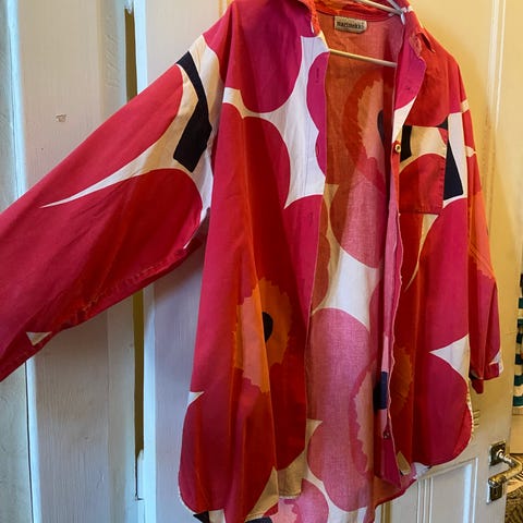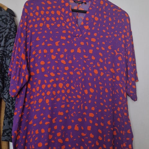 Marimekko naisten paita, koko S. Materiaalina puuvilla. Paidassa on monivärinen, pisaramainen kuosi tummalla pohjalla. Puolipitkät hihat ja pyöreä pääntie. Sopii arkeen ja vapaa-aikaan.