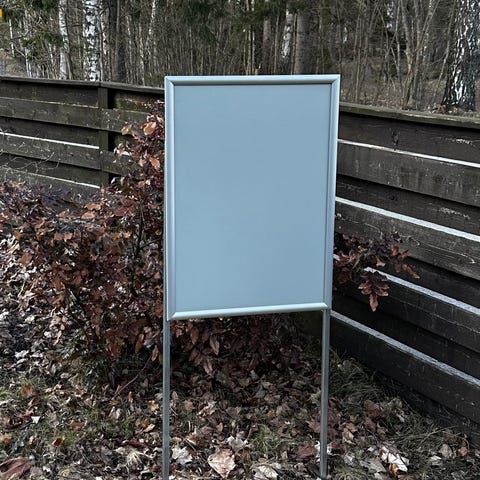A-teline mainoskyltti ulkokäyttöön. Materiaalina metalli, väri valkoinen. Kaksipuolinen rakenne, johon voi kiinnittää julisteet tai kyltit molemmille puolille. Soveltuu esimerkiksi liikkeen, tapahtuman tai muun toiminnan opasteeksi pihalle tai kadun varteen.