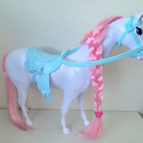 Kaksi samanlaista hevosta yht.5e,vaaleanpunainen hevonen2e,lehmä 1e,pinkki pehmo 4e ja pikku pehmot 0,50e ja Minni-Hiiri nukke 2e. Koira koti.