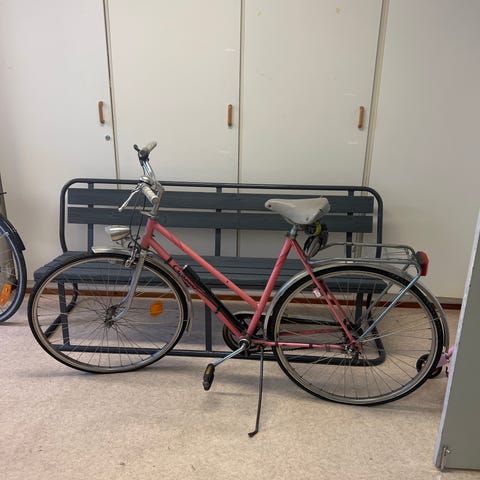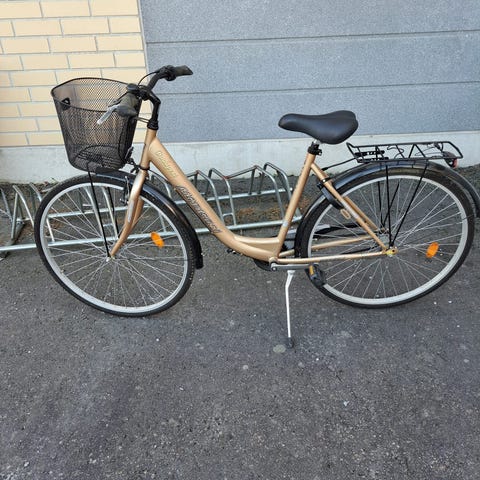 Matala runkoinen. Hyvä kuntoinen polkupyörä. Kori edessä. Käsi- ja jalkajarru. Kolme vaihdetta.