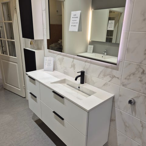 alakaapisto vaalea puusyy mikrolaminaatti ovet leveys 600 mm ja syvyys 360, peilikaappi valaisimella leveys 600 mm ja korkeus 704 mm + valaisin, Damixa hana bideellä sekä posliiniallas.