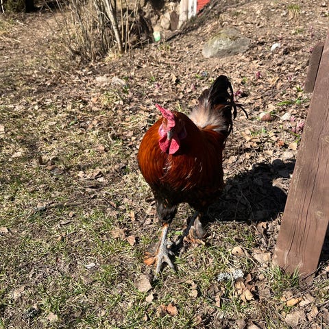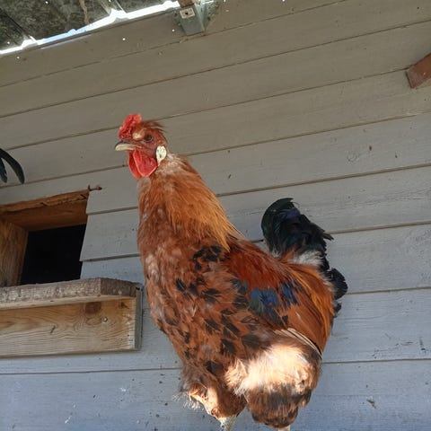 Kukko, päävärinä musta ja punainen heltta. Soveltuu siipikarjan pitoon tai kotikanalaan. Kuvasta näkyy linnun yleinen ulkonäkö ja väritys.