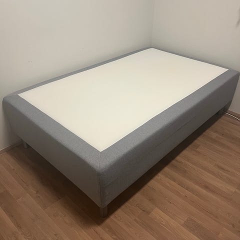 IKEA sänky runkopatjalla ja petauspatjalla. Sängyssä on harmaa runkopatja sekä jos haluaa mukaan kuvassa näkyvän valkoisen petauspatjan. Rungossa on puiset jalat ja pohjassa puinen rakenne. Sopii yhden hengen sängyksi makuu- tai vierashuoneeseen. Korkeus 52cm, leveys 120cm, pituus 200cm. Todella mukava sänky.