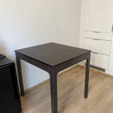 Puinen ruokapöytä, jonka saa pidennettyä.