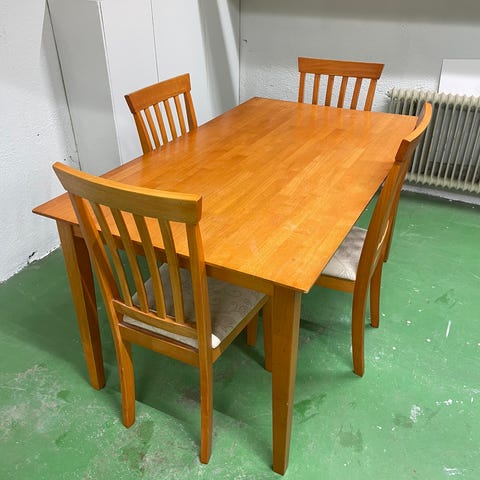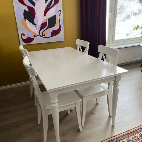 Pituus 140cm plus jatkopala asennettavissa tarvittaessa, 50cm, leveys 90cm, Korkeus 74cm. Juuri hiotte ja käsitelty vahalla. Etsii uutta kotia sillä meille liian iso. Mukaan 6 tuolia. Täyttä puuta (mänty varmaan)