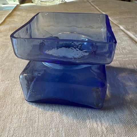 Riihimäen Lasin Pala-maljakko, suunnittelija Helena Tynell, kirkas lasi, korkeus 12 cm, leveys 10,5 cm, syvyys 10,5 cm.
