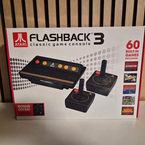 Atari Flashback 8 Gold retro pelikonsoli. Paketissa on pelikonsoli, kaksi joystick-ohjainta sekä tarvittavat kaapelit. Konsoli kytketään televisioon HDMI-liitännällä. Laitteeseen on esiasennettu yli 200 klassista Atari-peliä, joita voi pelata suoraan ilman erillisiä pelikasetteja. Nouto / postitus ostajan kustannuksella