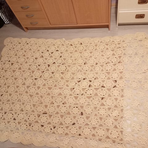 Hyvä kuntoinen peitto. Kissatalous niin kissan kynteen varmaan tarttunut niin langanpätkiä siellä täällä. Vasta pesty.