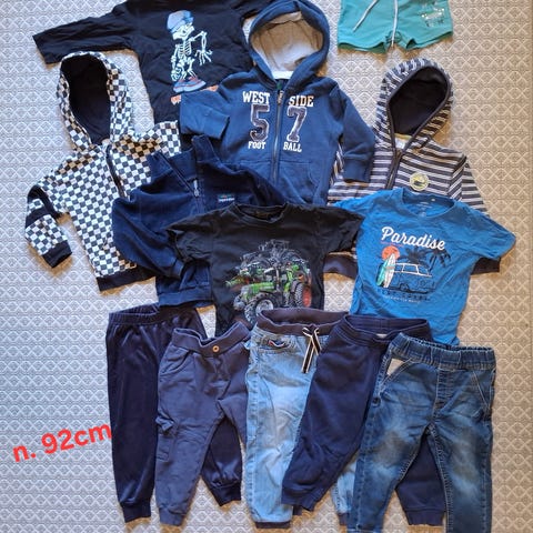 Poikien vaatepaketti, koko 92. Paketissa on monenlaisia vaatteita kuvat puhuvat puolestaan. Osa vaatteista saattaa olla nimettyjä yleiskunto hyvä.