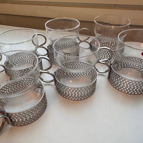 Tsaikka glögilasit metallisilla alustoilla. Kupit ovat sinistä lasia ja niissä on metallinen korva. Myydään kuvassa näkyvänä settinä.