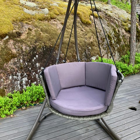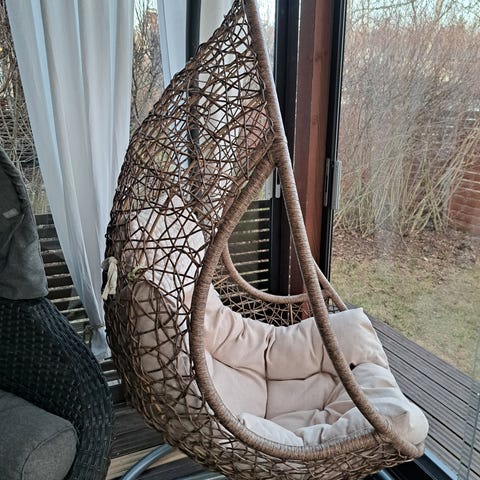 Riippuva riippukeinutuoli ulkokäyttöön. Tuolissa on rottinkia jäljittelevä runko ja pisaranmuotoinen kori, joka on kiinnitetty metalliseen jalustaan. Istuinosassa on useita harmaita pehmusteita, mukaan lukien istuin-, selkä- ja niskatyyny. Sopii terassille tai parvekkeelle istuma- ja rentoutumispaikaksi. Materiaalit: metallirunko, rottinkijäljitelmä ja kangaspäällysteiset pehmusteet.