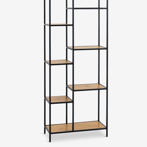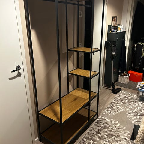 Myydään kuin uuden veroinen Jyskin 7-hyllyinen Trappedal avohylly. Mustat kehykset ja hyllylevyt tammen sävyiset.