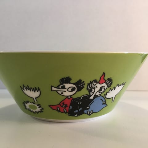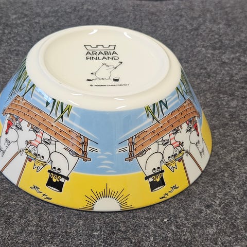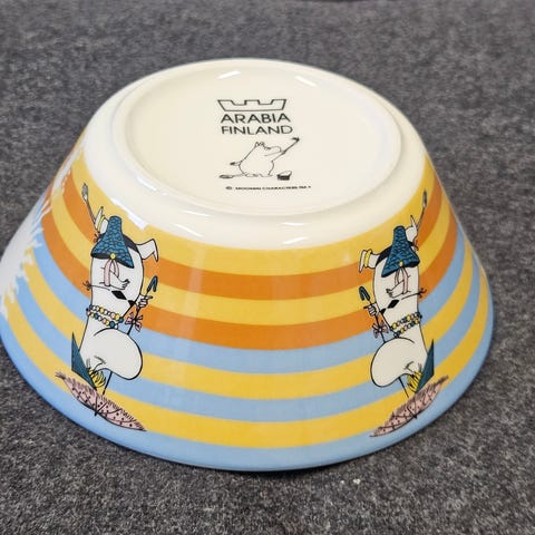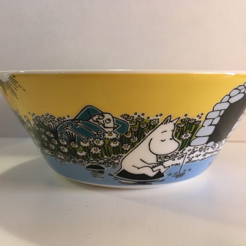 Arabia Muumi Purjehtien Tahmatassun & Tuutikin kanssa -kulho keltaisella kuvituksella. Kesän 2014 malli.