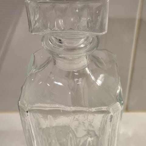 Hyväkuntoinen viskikarahvi + lasinen korkki.