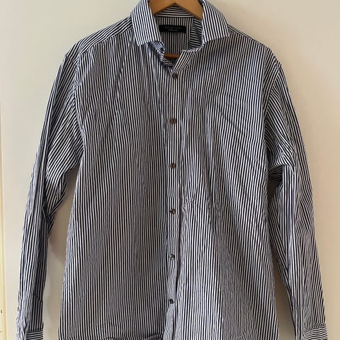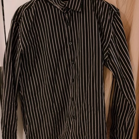 Marimekko miesten kauluspaita, koko M. Musta puuvillapaita, jossa pystyraita-kuvio. Pitkät hihat ja nappikiinnitys edessä. Kainalo kainalo mitta noin 62cm. Viisi vuotta vanha. Käytetty juhlissa noin 4-5 kertaa. Pesty joka käytön jälkeen.