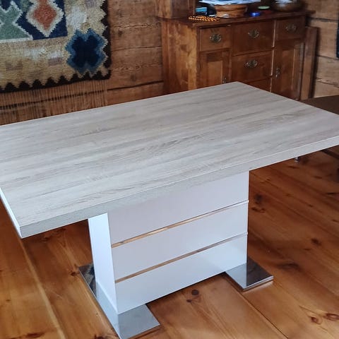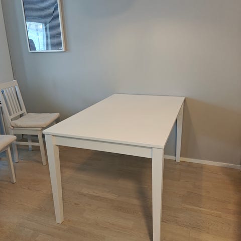 Kohtuullisessa kunnossa oleva ruokapöytä. Harmaa/valkoinen.