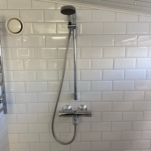 Suihkusetti, jossa on yläsuihku, käsisuihku, letku ja seinäkiinnikkeet. Materiaalina pääosin metallia ja muovia, värinä kromi. Sopii kylpyhuoneen suihkutilaan tavalliseen suihkuasennukseen.
