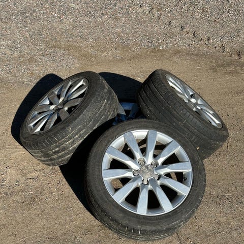 Et hieman kysymysmerkki, taitaa olla 18. Tulkitse itse viimeistä kuvaa. Keskireikä iso, audin soviterenkaat paikallaan. 2 hyvää rengasta, kaksi risaa. Itse vanteet lähes virheettömässä kunnossa.