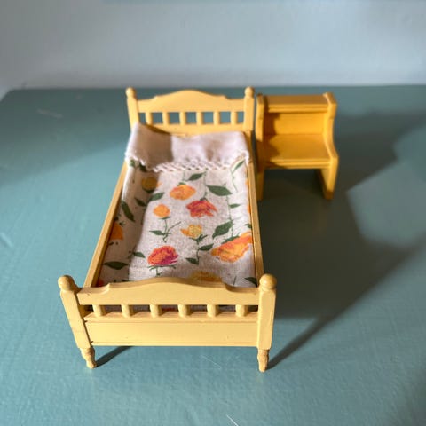 Lundby nukkekoti vintage makuuhuoneen kalustesetti. Kokonaisuuteen kuuluu sänky patjalla, päätyyn kiinnittyvä hylly- ja kaappiyksikkö sekä pyöreä jakkara. Tämä on ensimmäinen sänky tätä mallia, 70-luvun alusta. Taustalevy irti, saa muutamalla liimatipalla kiinni. Itselläni pysynyt hyvin seinään vasten ilmankin.