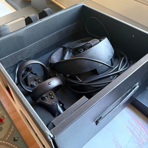 Oculus Rift virtuaalilasit ohjaimilla. Pakettiin kuuluu VR-headset kaapeleilla sekä kaksi käsiohjainta. Toisessa ohjaimessa halkeama, mutta ei vaikuta käyttöön. Mukana kaksi johtoa, toinen toimi heikosti.