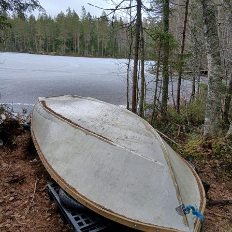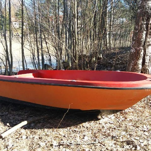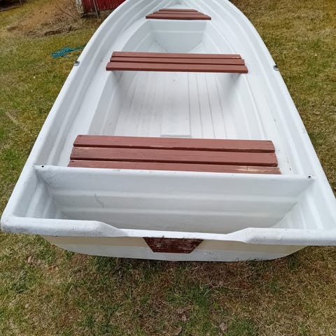 Ollut valkoinen. Maalattu vihreäksi 15v sitten. Nyt kesii vihreä irti . Ei ole vuotanut vielä tähän asti ja voidaan kokeillakkin vedessä jos pelottaa. Ei airoja tms mitään tarvikkeita.
