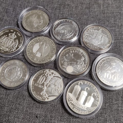 Kuvien 12 juhlarahaa, joista 9 kpl 500 Ag, 2 kpl 830 Ag ja 1 kpl 925 Ag. Osta tai tarjoa.