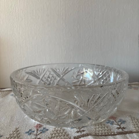 Kristalliset tarjoilulautanen ja kaksi kulhoa.