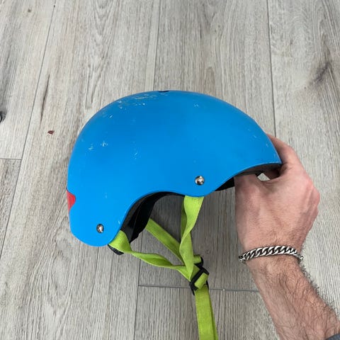 Lasten pyöräilykypärä vaaleansinisellä kuorella. Kypärässä on useita ilmanvaihtoaukkoja ja pehmustettu sisäosa. Säädettävä hihna leukakiinnityksellä auttaa istuvuuden säätämisessä. Soveltuu pyöräilyyn ja muuhun rullailuun, kuten potkupyöräilyyn tai rullaluisteluun, lapsille sopivassa koossa.