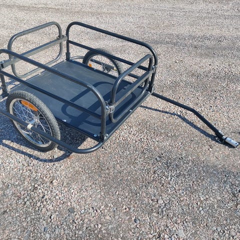 Vähän käytetty, ostettu uutena 2025, Metallinen teräsrunkoinen polkupyörän tavarankuljetusperäkärry, jossa on musta runko ja verkkopohjainen kuormatila, 20*4.0 rengas, lokasuoja ja jousitettu takapää. Etupäässä on vetopuomi kiinnitystä varten polkupyörän pikalukolliseen taka-akseliin. Suoriteltu kuorman painoraja 32 kg