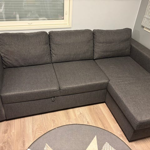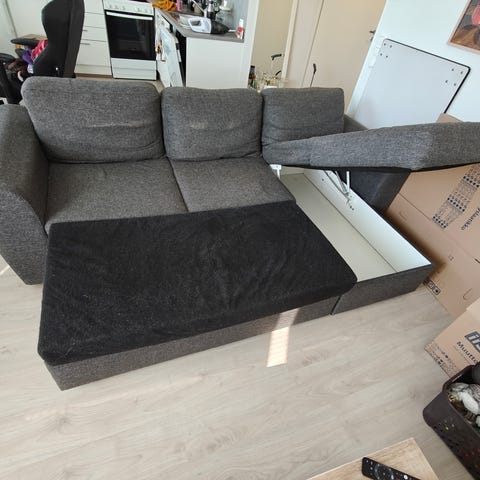 Kuvassa oleva harmaa divaani vuodesohva. Leveys 250, syvyys 90 ja divaanin syvyys 160.
